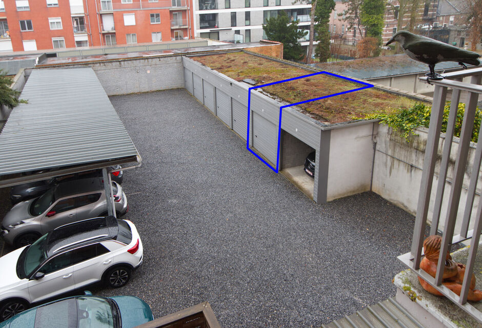 De mooie garagebox op het gelijkvloers met groendak en automatische sectionaalpoort, voorzien van licht en elektriciteit, is NIET in de prijs inbegrepen maar kan mee aangekocht worden voor € 24.000,-