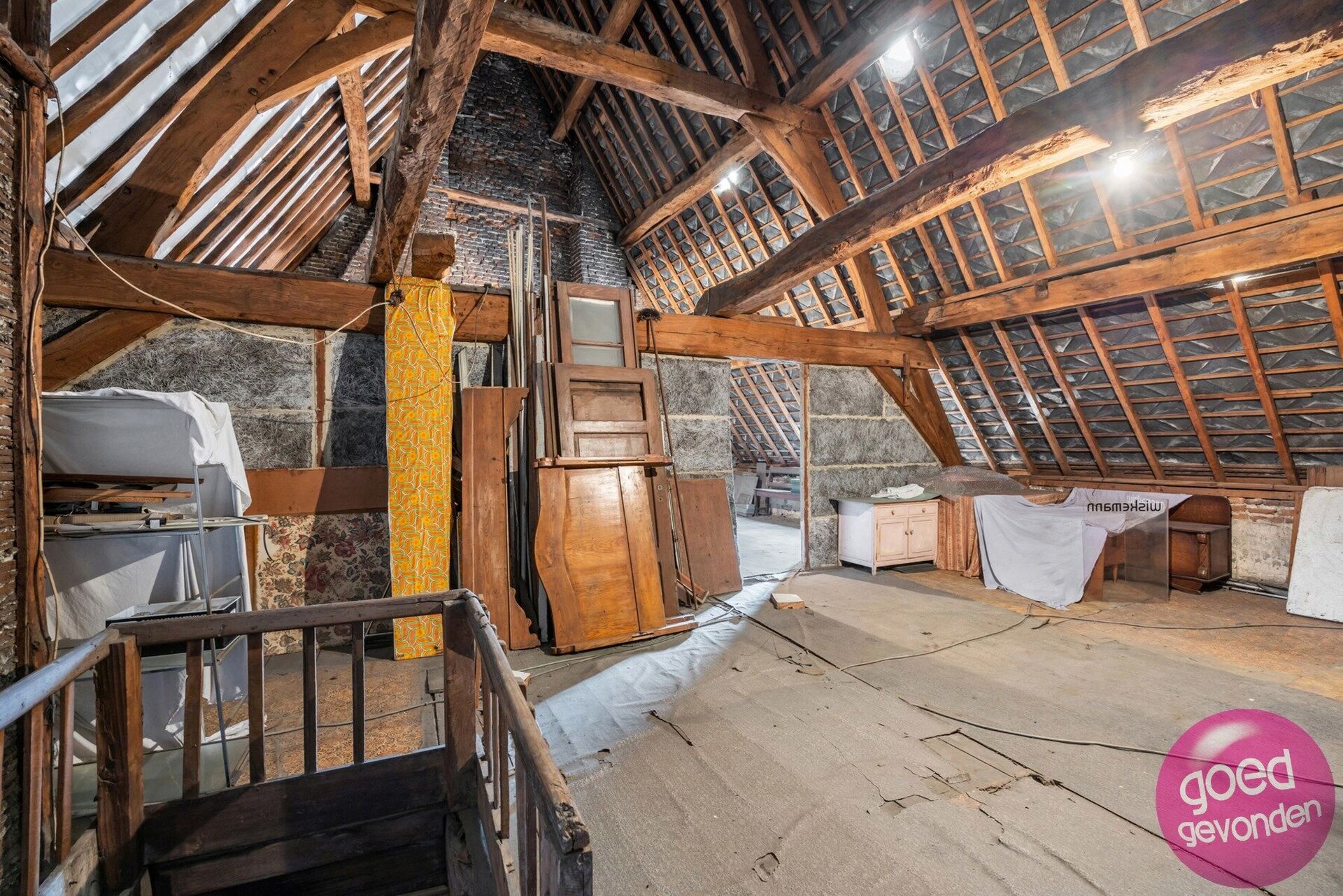 Het oorspronkelijk dakgebinte is bewaard gebleven en verkeert is uitstekende staat en geeft tonnen karakter aan deze ruimte, wat u er ook mee doet. Er is in ieder geval plaats voor een appartement van 100 m², en gezien de nokhoogte van het dak is ook een duplex-appartement een mogelijkheid.