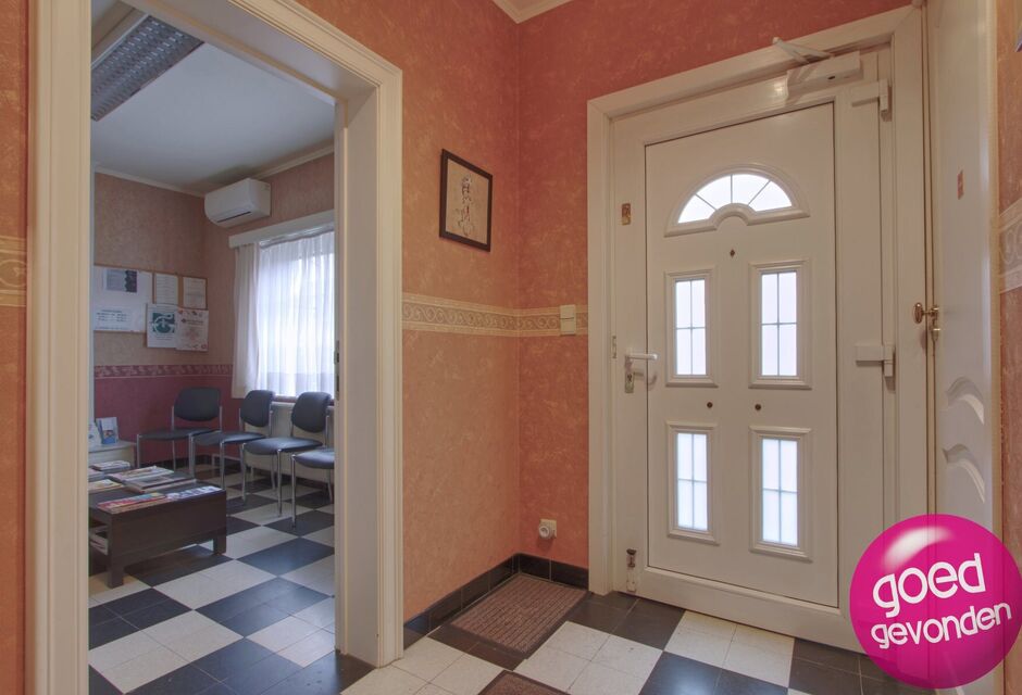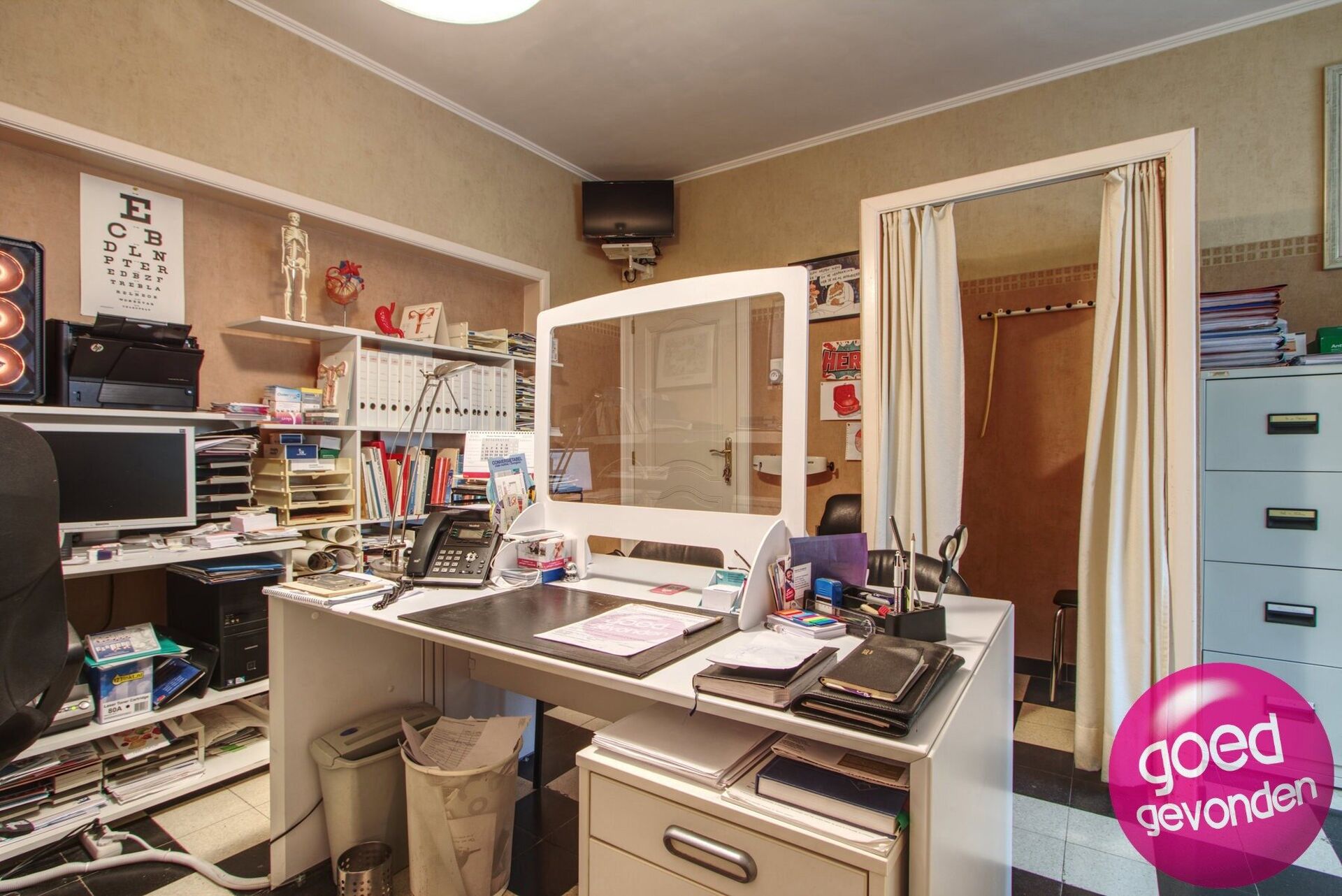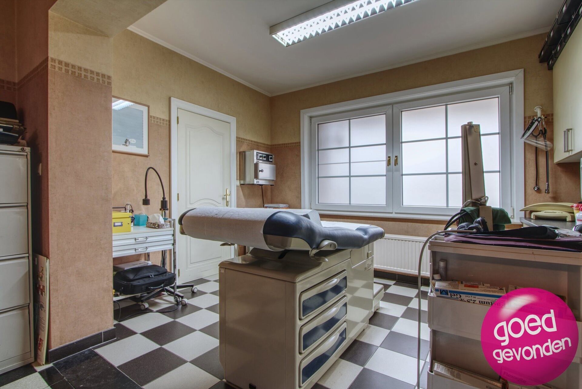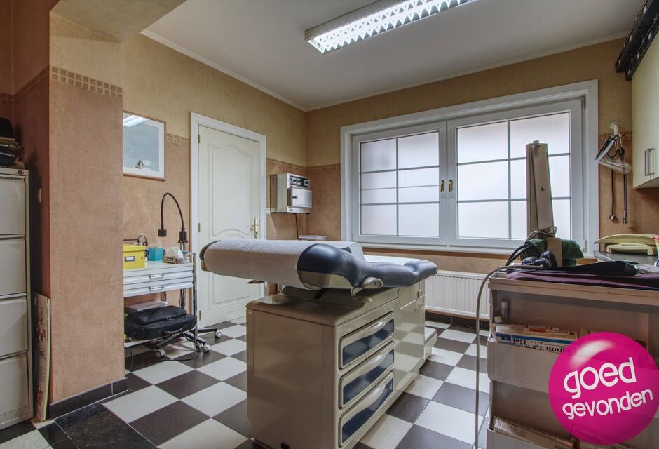+ inkomhal met toilet, wachtzaal, grote praktijkruimte, slaapkamer met badkamer en overdekt terras op het gelijkvloers