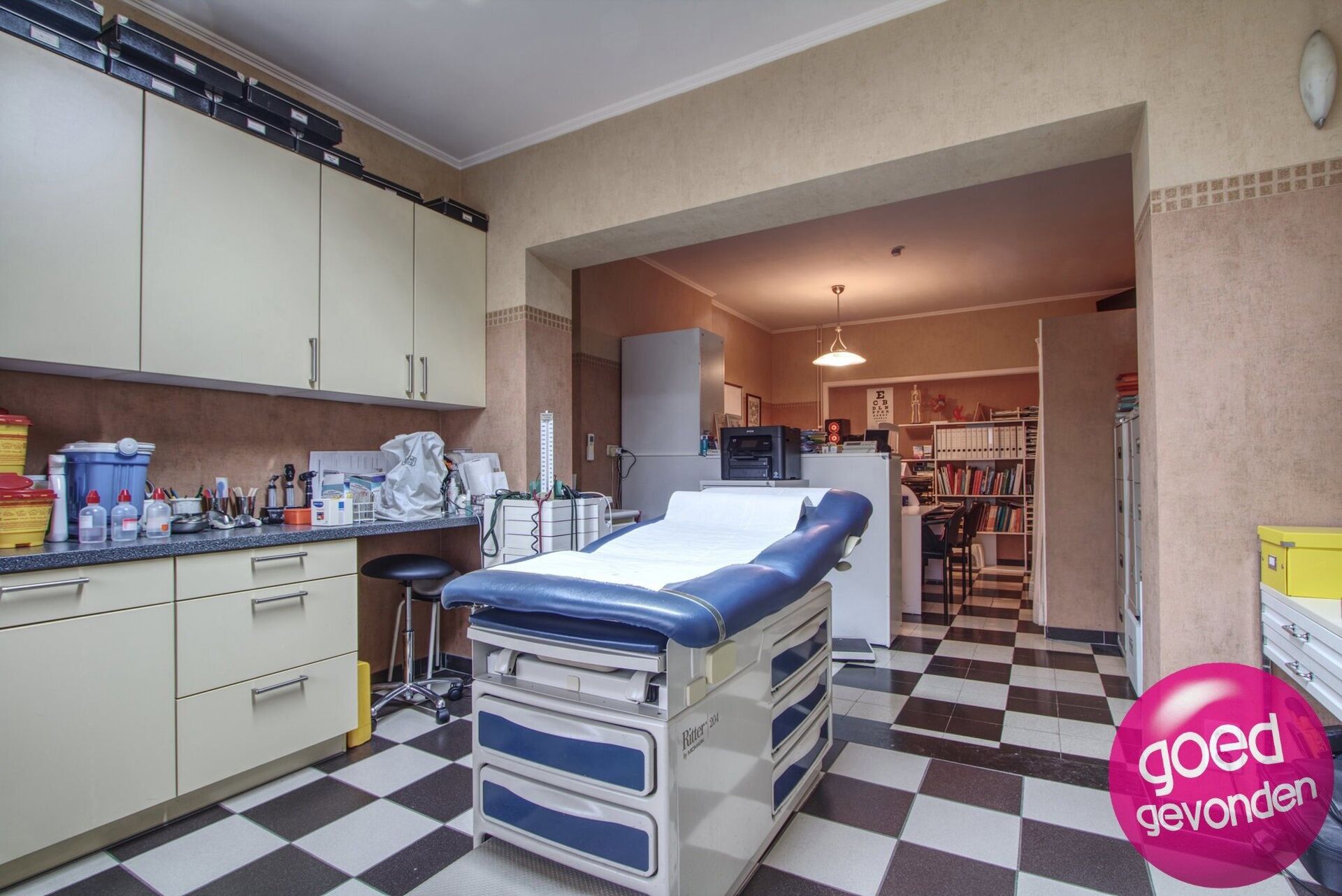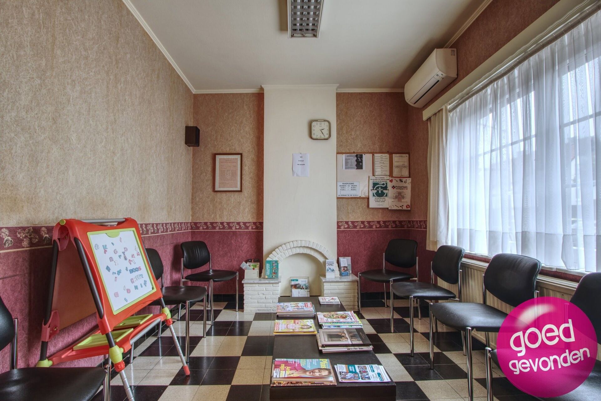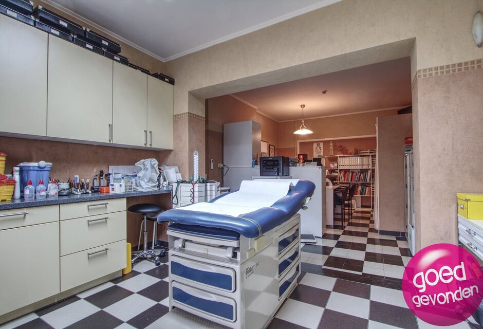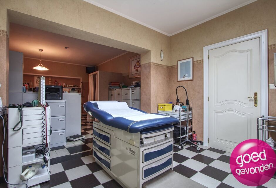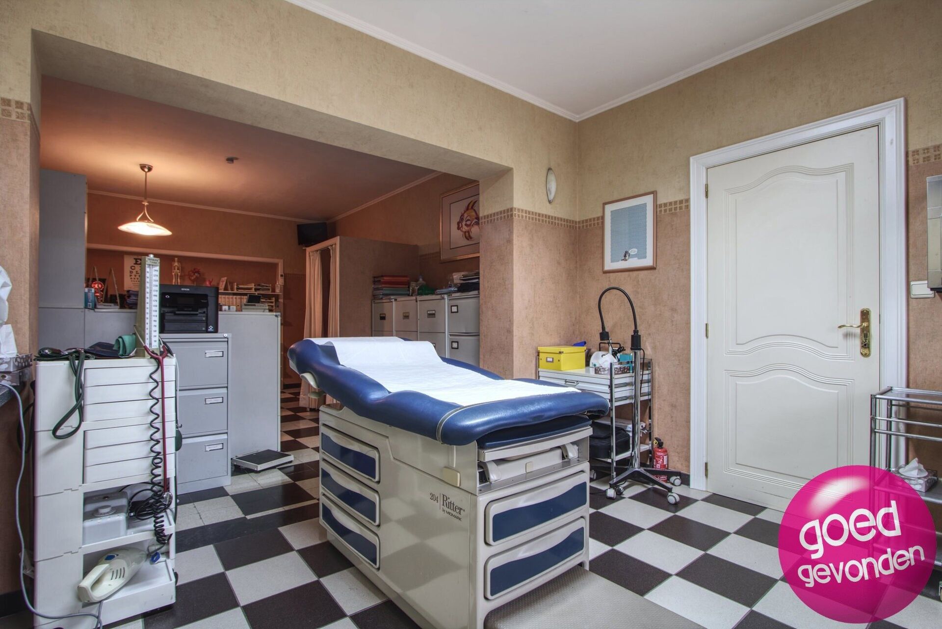 + inkomhal met toilet, wachtzaal, grote praktijkruimte, slaapkamer met badkamer en overdekt terras op het gelijkvloers
