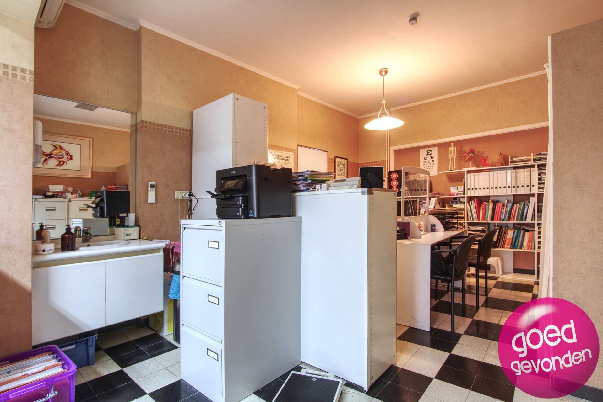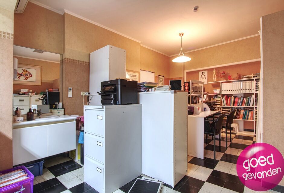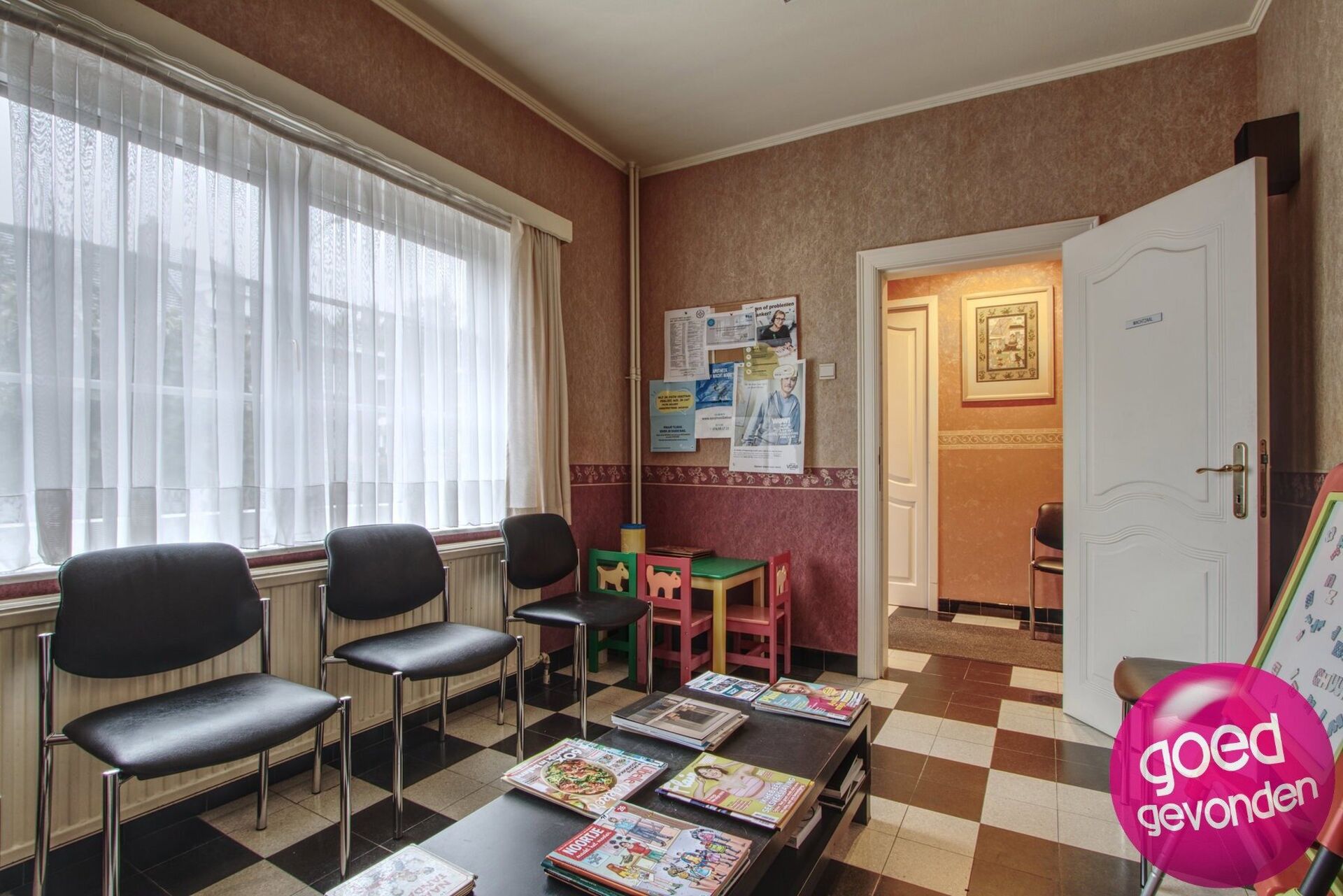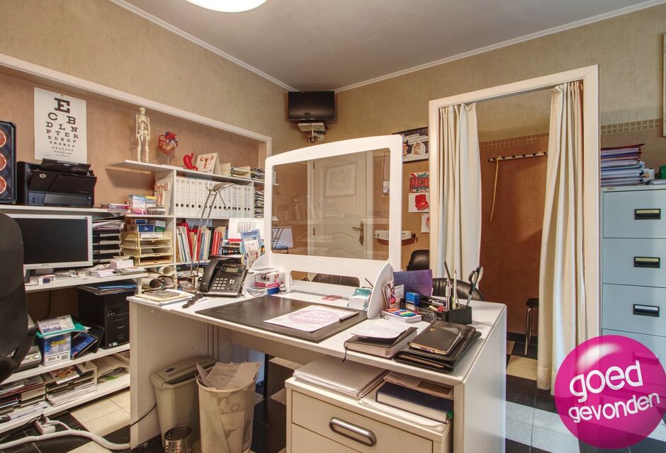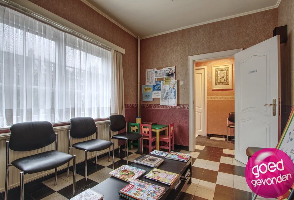 + inkomhal met toilet, wachtzaal, grote praktijkruimte, slaapkamer met badkamer en overdekt terras op het gelijkvloers