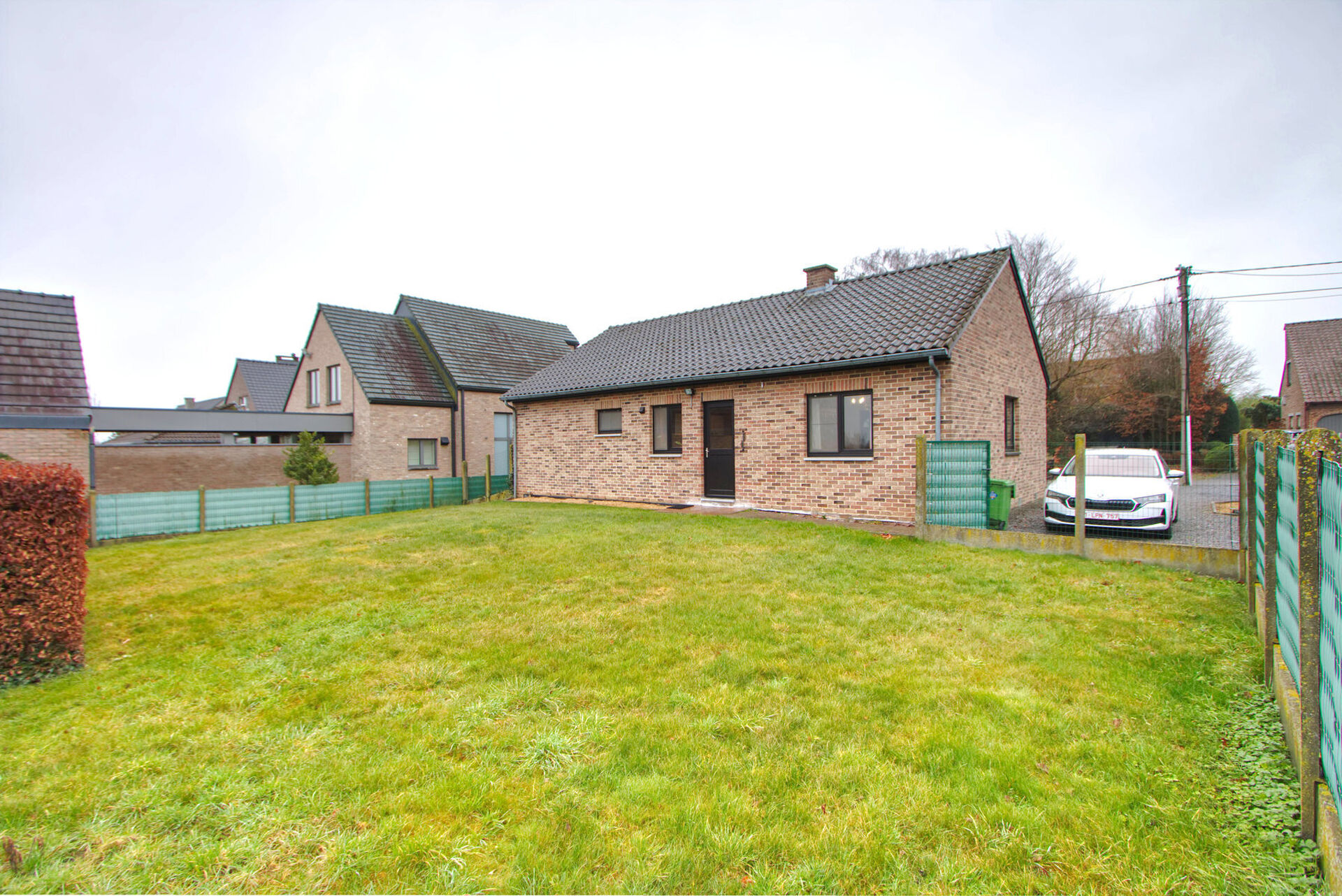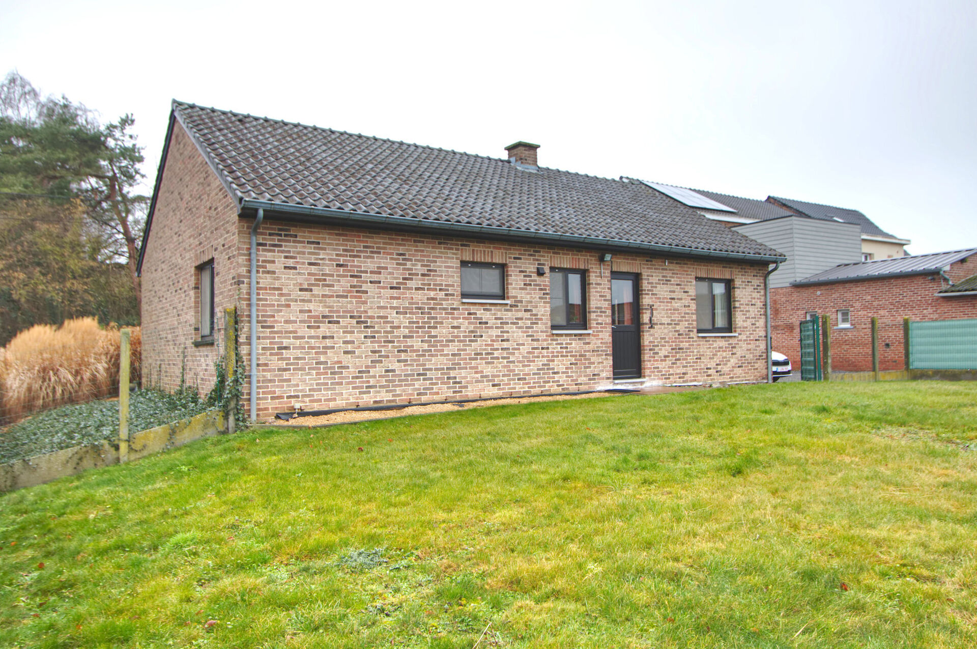 De woning is diep ingeplant op het perceel en wordt omringd door een mooi aangelegde voortuin. Langs de woning bevindt zich een zeer ruime bovengrondse parking. Achteraan ligt een volledig omheinde tuin met aansluitend een ruime, eveneens omheinde weide.