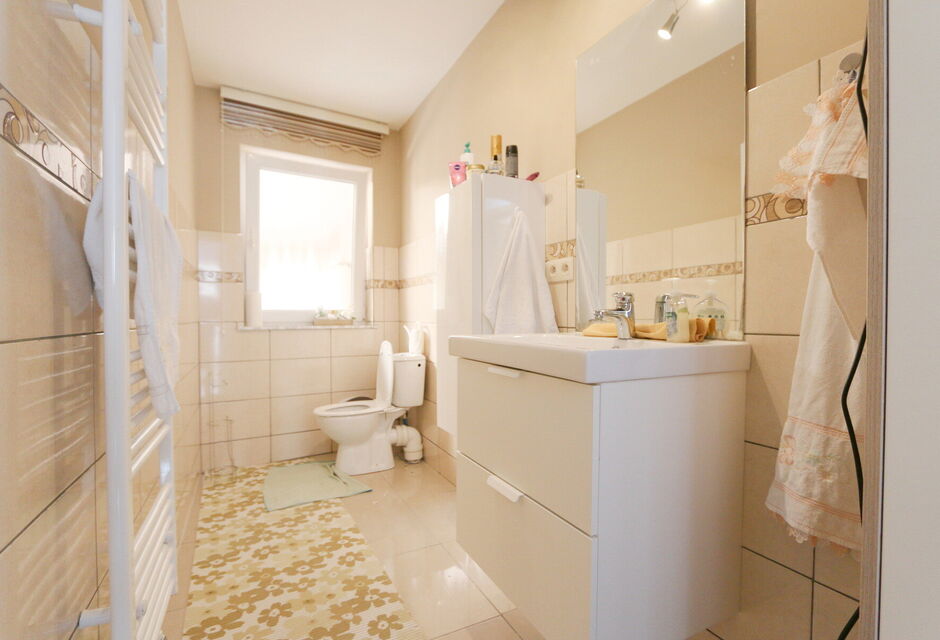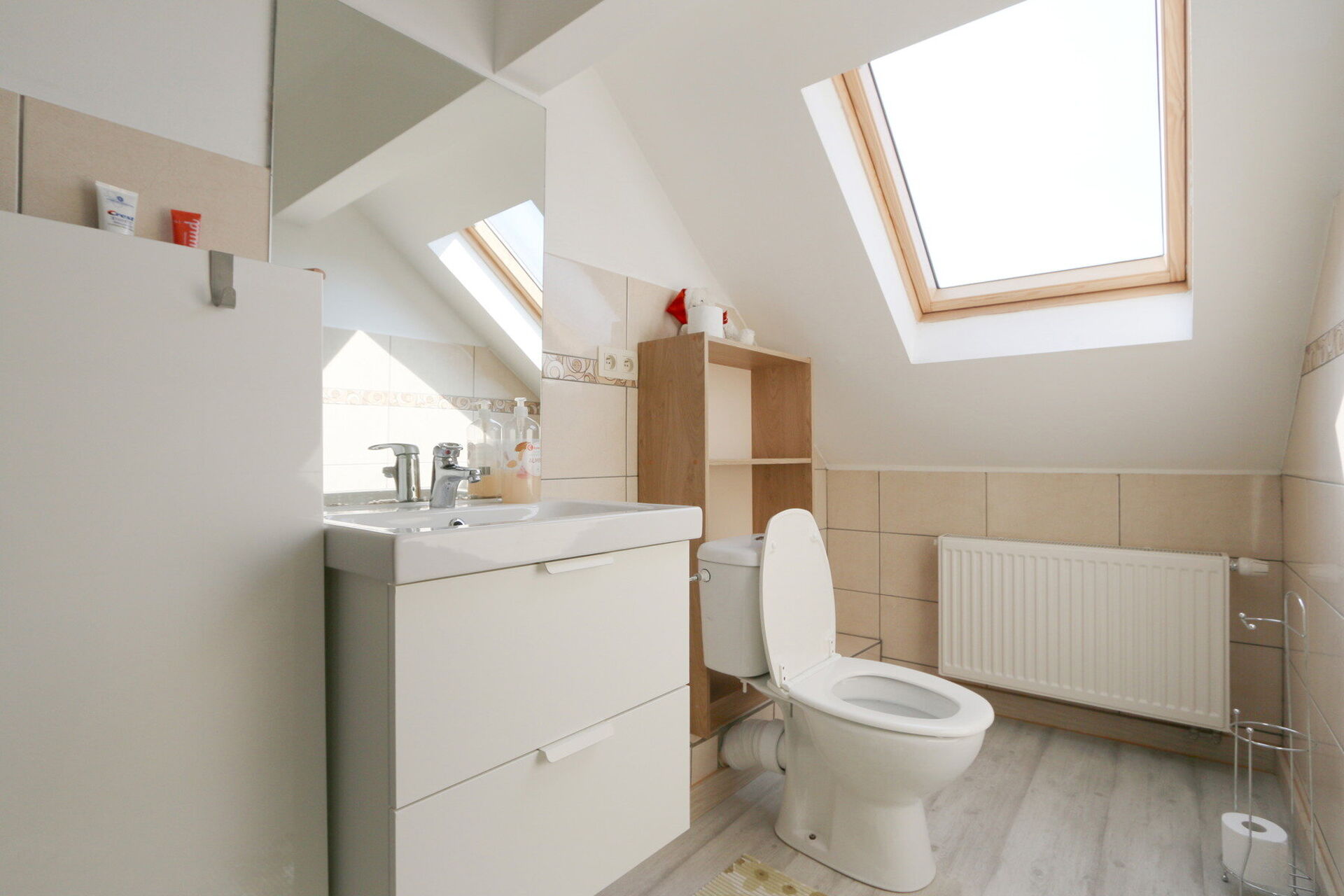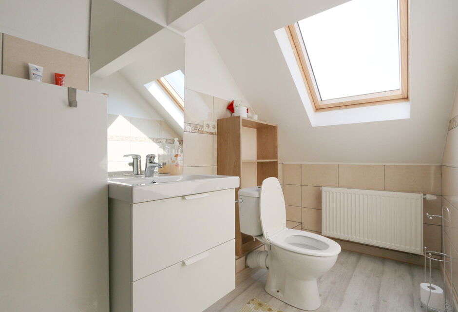 - badkamer voorzien van wc, lavabo met spiegelkast en verwarming